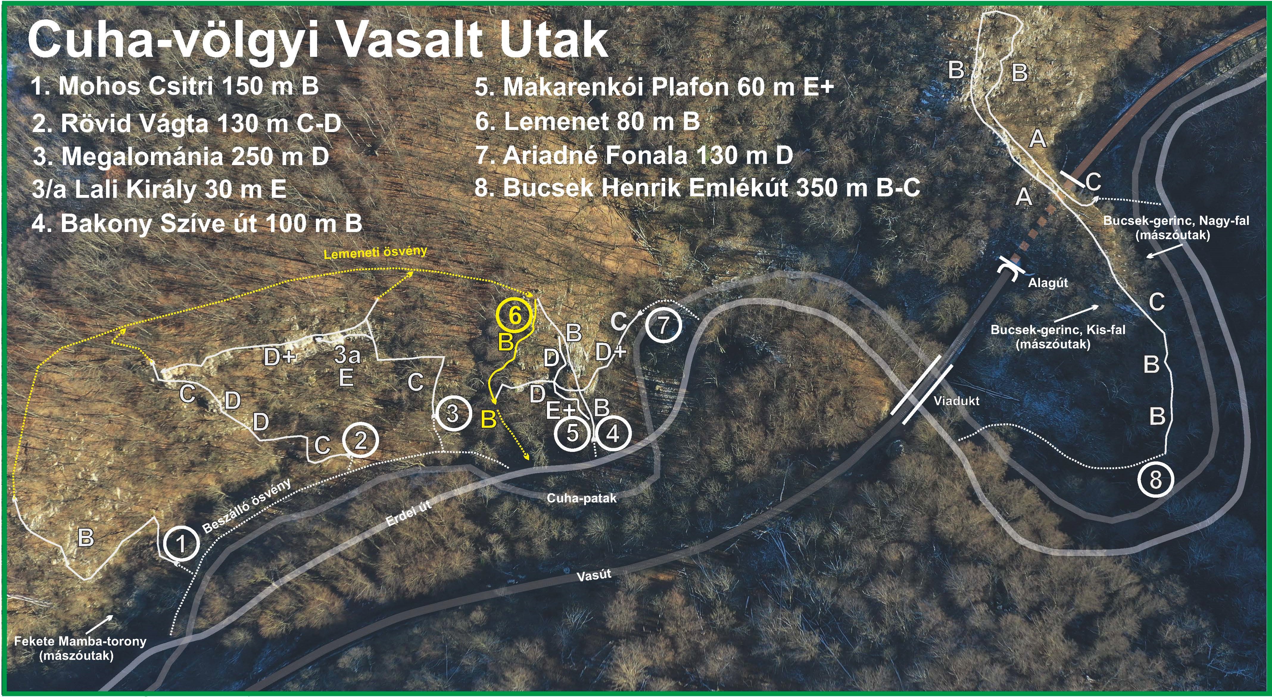 A Cuha szikláinak egésze biztonságosan, sűrűn lett kinittelve. Az utak kiépítésében egy kis team vett részt: Fucskó László, Kovács Attila, Zoltai György Zozó, Rodom Modor, Babcsán Gábor és Kovács Tamás. A falak alatti rendezést Babcsán Bernát (nagyrészt) és Kemler László végezte. A szurdok kijárata felé még két kisebb fal épült ki változatos utakkal. A “Fekete Mamba-torony” egy 16 m magas, vad és áthajló letörés. Itt, a Dunántúlon egyedülálló módon fél tucat mesterséges mászóút (A1-A2) épült ki. Ezekben részben vannak nittek a biztonság érdekében, de a feljutáshoz ékeket és friendeket is kell használnunk. Ez a hely igen jó lehetőséget biztosít a mesterséges mászótechnika elsajátítására a könnyebb „techno” fokozatban. A Fekete Mamba-torony jobb oldalán van néhány szép sportmászóút is, köztük a torony névadó útja a Fekete Mamba. A “Bakonyalja-fal” egy kicsiny, reibungos formakincsű letörés a kijárat felé. Ironikus elnevezése arra utal, hogy ez csak egy kis bevezető a Cuha igazán szép útjaihoz.